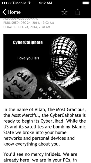 Hackers apparently commandeered the Albuquerque Journal’s mobile app Wednesday morning, giving top billing to a story that expressed support for the Islamic extremist group ISIS and warned citizens of Albuquerque that their personal secrets were being collected through mobile devices, with plans to expand the havoc to other locations.